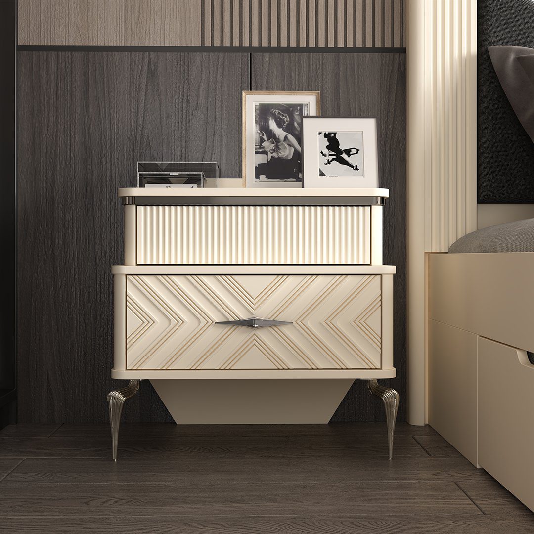 سرویس خواب دو نفره رویسا با رنگ نسکافه ای بسیار جذاب و طراحی خاص و بینظیر در قسمت لمسه کاری های تخت همه چشم ها را به خود خیره میکند. زیر تخت کشو بکار رفته که فضای بیشتری را در اختیار شما قرار می دهد.تمامی قسمت های چوبی از ام دی اف درجه یک وارداتی ساخته شده و تمامی یراق آلات و دستگیره ها نیز وارداتی و بسیار با کیفیت هستند.سرویس خواب شامل تخت پاتختی میزآرایش و عسلی میشود.
