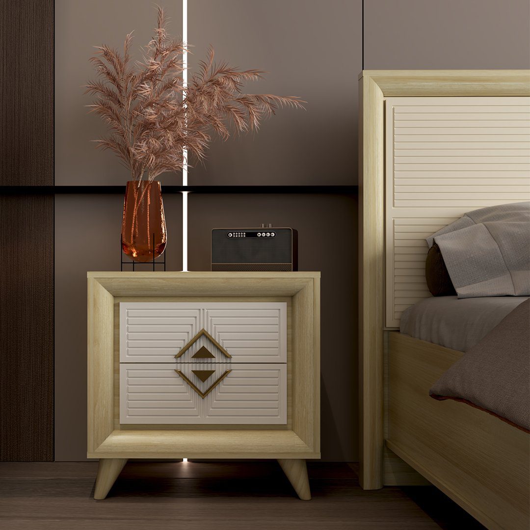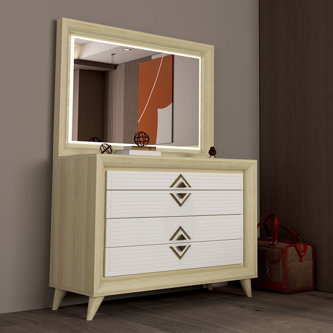 سرویس خواب دو نفره درسا دارای نمای هایگلاس و خطوط هندسی در قسمت بالای کلگی بالا و پایین تخت است ؛که بیشترین جلوه سرویس خواب در همان قسمت کلگی بالاست ، ترکیب دو رنگ در قسمت کلگی بالای محصول باعث شده نمای روبروی سرویس خواب درسا از ما بقی محصولات خاص تر باشد . هماهنگ بودن خطوط کار شده روی سرویس خواب جلوه محصول را دو چندان کرده است . استفاده از پروفیل ربع دایره در سرویس خواب و دیگر اقلام نه تنها باعث زیبایی بیشتر محصول شده بلکه از نظر ایمنی در برخورد با اعضای بدن نیز ارگونومیک می باشد . نورپردازی در قسمت بالای میز آرایش علاوه بر جنبه کاربردی روشنایی جنبه زیبایی و دکوراتیو هم دارد.