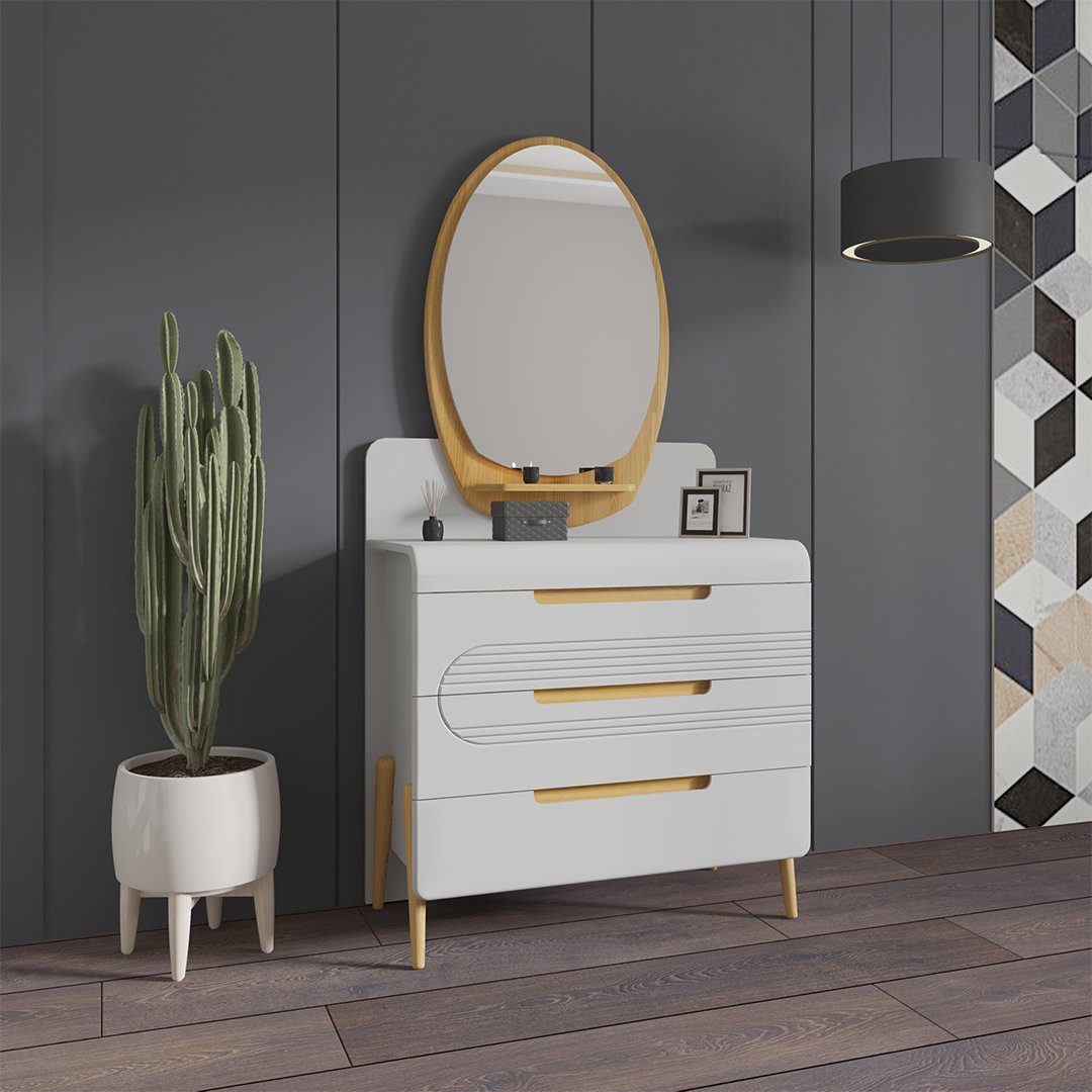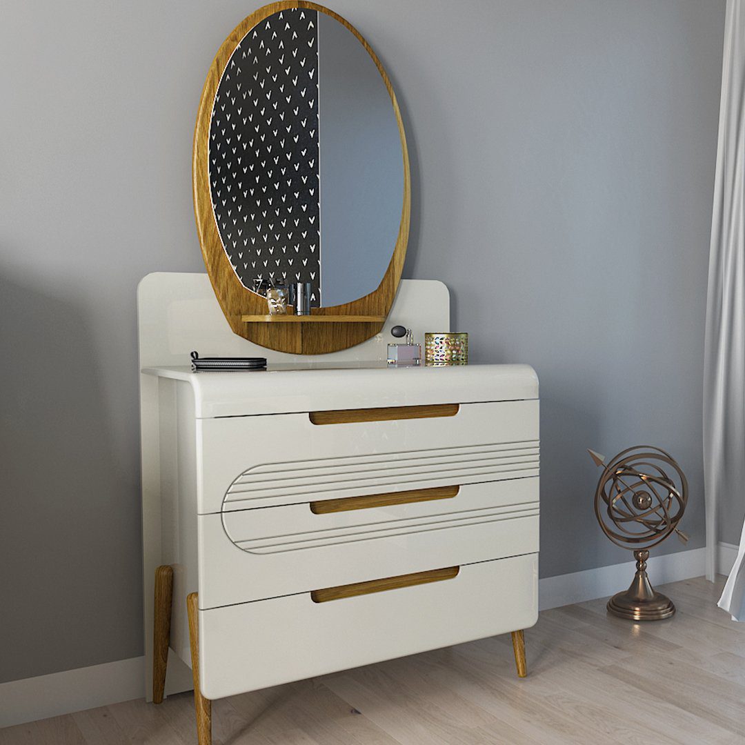 میز آرایش دیبا با طراحی نئوکلاسیک و بسیار خاصی که دارد؛ باعث شده تاطرفدار های فراوانی داشته باشد.جنس میز آرایش از ام دی اف درجه یک است و تمامی یراق آلات نیز بسیار با کیفیتی و وارداتی هستند.طراحی بیضی آینه و کشو ای که زیر آینه بکار رفته حس و حال سبک مینیمال را به افراد القا میکند.رنگ بدنه میزآرایش کرم روشن است و قسمت های پایه و دستگیره ها از چوب طبیعی ساخته شده است.روی میزآرایش سی ان سی بکار رفته که ظاهر میز آرایش را بسیار شکیل کرده است.