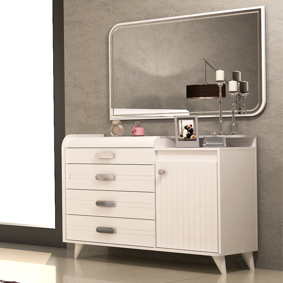 • میز آرایش با چهار کشو کاربردی: کشوی اول با بخش‌بندی لوازم آرایش و سه کشوی عمیق