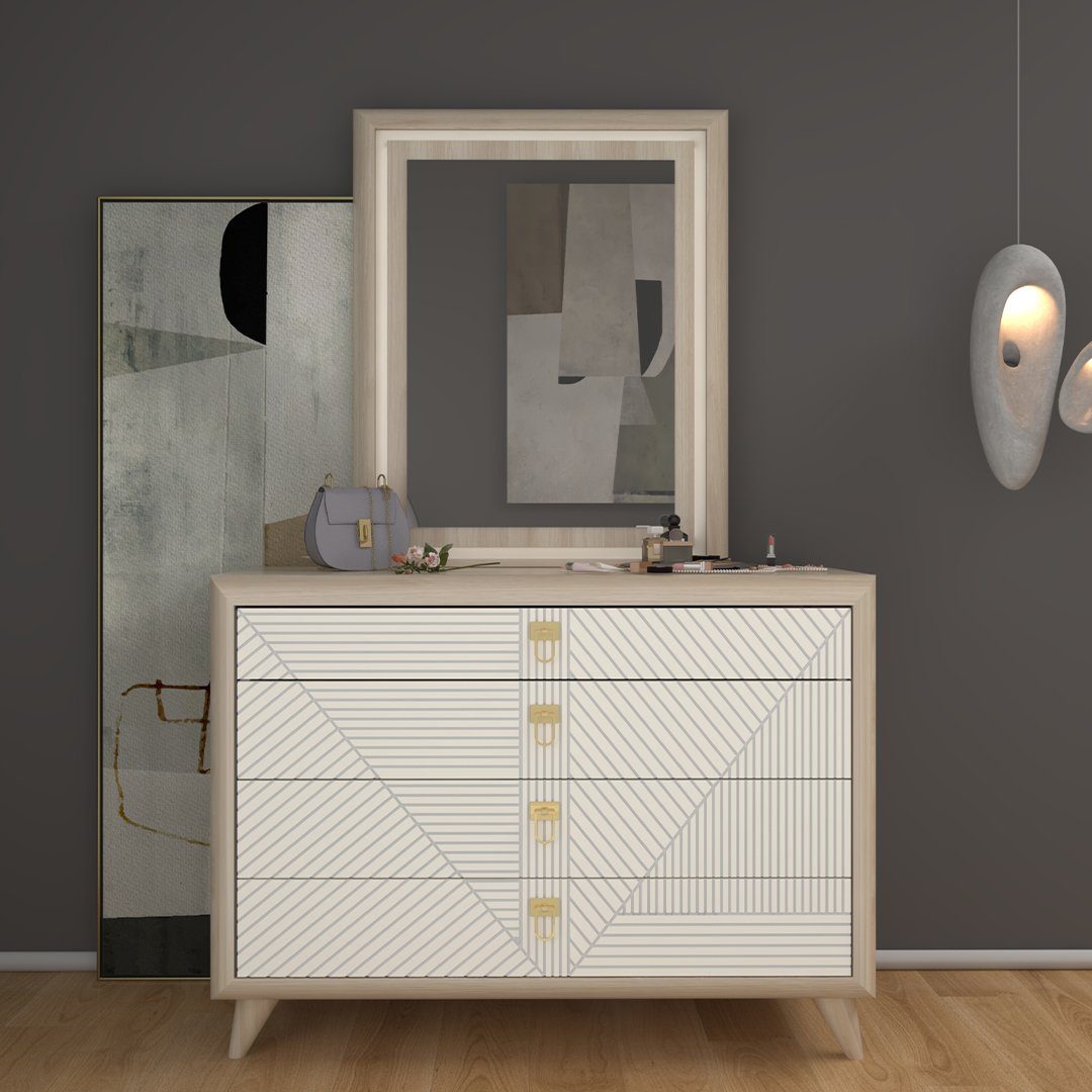 استفاده از پروفیل ربع دایره در سرویس خواب و دیگر اقلام  نه تنها باعث زیبایی بیشتر محصول شده بلکه از نظر ایمنی در برخورد با اعضای بدن نیز ارگونومیک می باشد . نورپردازی در قسمت بالای میز آرایش علاوه بر جنبه کاربردی روشنایی جنبه زیبایی و دکوراتیو هم دارد.