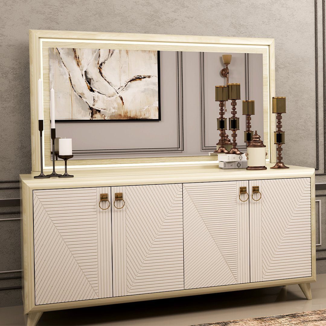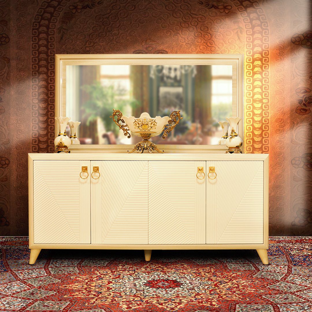 میز کنسول ملودی دارای نمای هایگلاس و خطوط هندسی در قسمت درب میز کنسول می باشد که بیشترین دید در همان قسمت درب و بدنه ی کنسول است. همچنین ترکیب دو رنگ در محصول و نمای روبرو و هماهنگ بودن خطوط در کل بدنه میز کنسول جلوه آن را دوچندان کرده است .