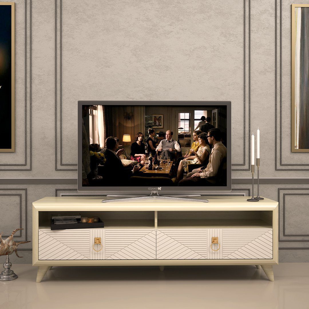 در نمای میز تلویزیون از رنگ کرم هایگلاس استفاده شده و استفاده از ورق بورا که جز رنگ ها جدید با به روزترین تکنولوژی روز دنیا با سیستم سینکرو نایز می باشد . این رنگ درای ویژگی هایی از قبیل داشتن گره هایی شبیه چوب و برجسته بودن و داشتن رنگ خاص که حس چوبی بودن محصول را به کاربر القا می کند.