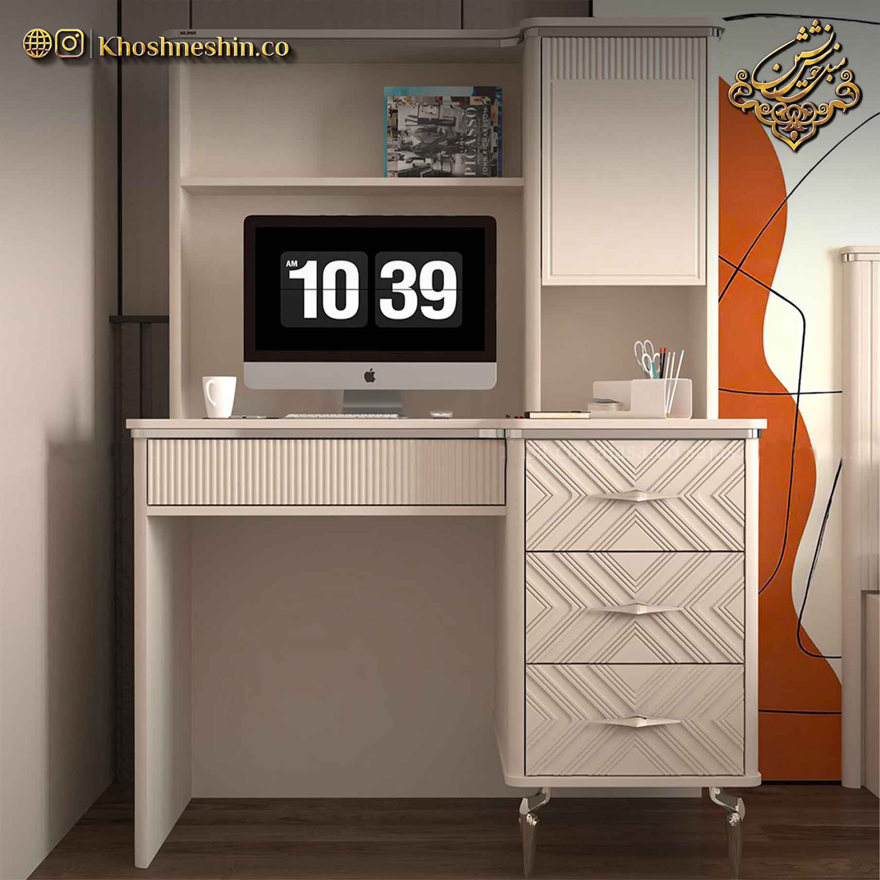 • میز تحریر مجهز به چهار کشو، یک کمد و شلف کاربردی