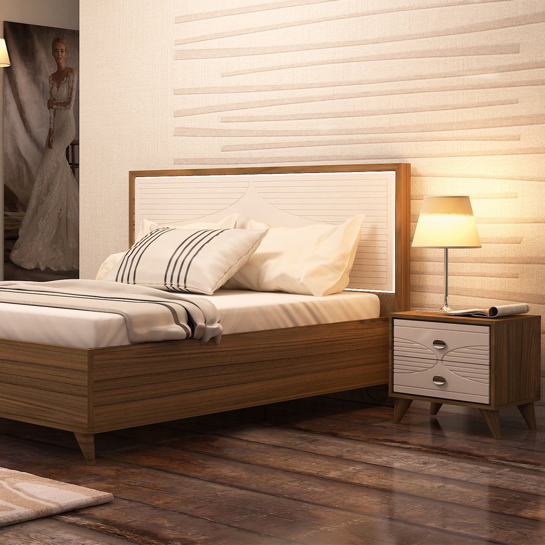 کف تخت های استفاده در این سرویس باعث می شود فشار و وزن کاربر به زمین وارد شود در نتیجه عمر سرویس خواب افزایش یافته و همچنین تخت فاقد هرگونه صدای مزاحم می باشد . این سرویس به دلیل طراحی دو رنگ تیره و روشن همیشه طراوت و جلوه ی خود را حفظ میکند و به راحتی با طیف گسترده ی رنگ های پرده ، فرش ، روتختی و کاغذدیواری ست می شود . به دلیل استفاده از دو رنگ مجزا در محصول باعث عدم خستگی دید در طولانی مدت میشود و همچنین کلاهای فوق به دلیل کمترین مصرف فضای پرت بسیار پر طرف دار است و مناسب تمای اتاق خواب ها میباشد و همچنین برای سهولت انتخاب دو سایز 160 و 180 قابلیت ارائه دارد.